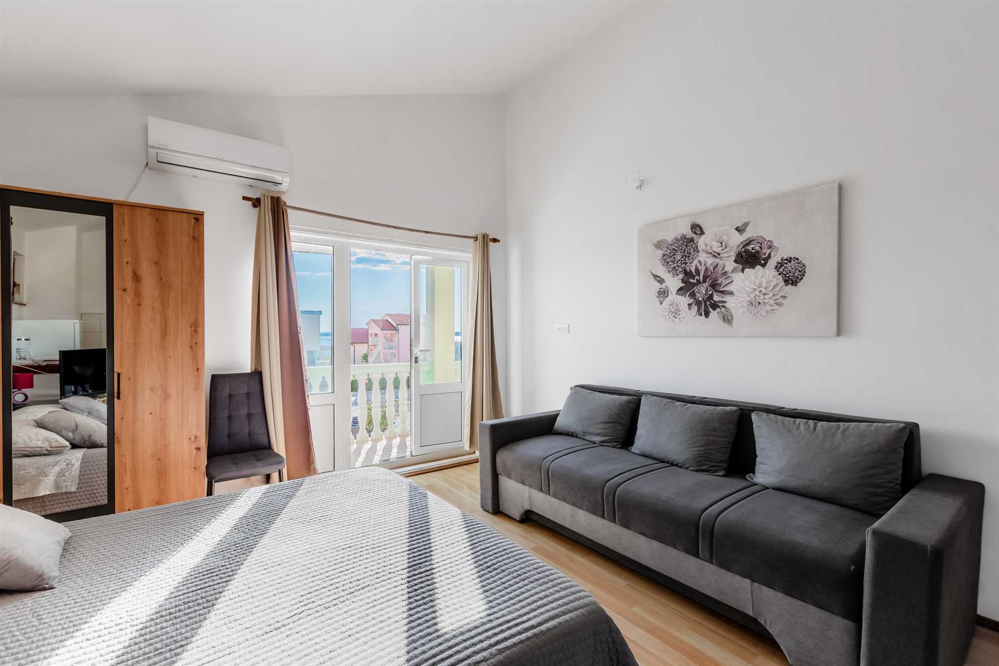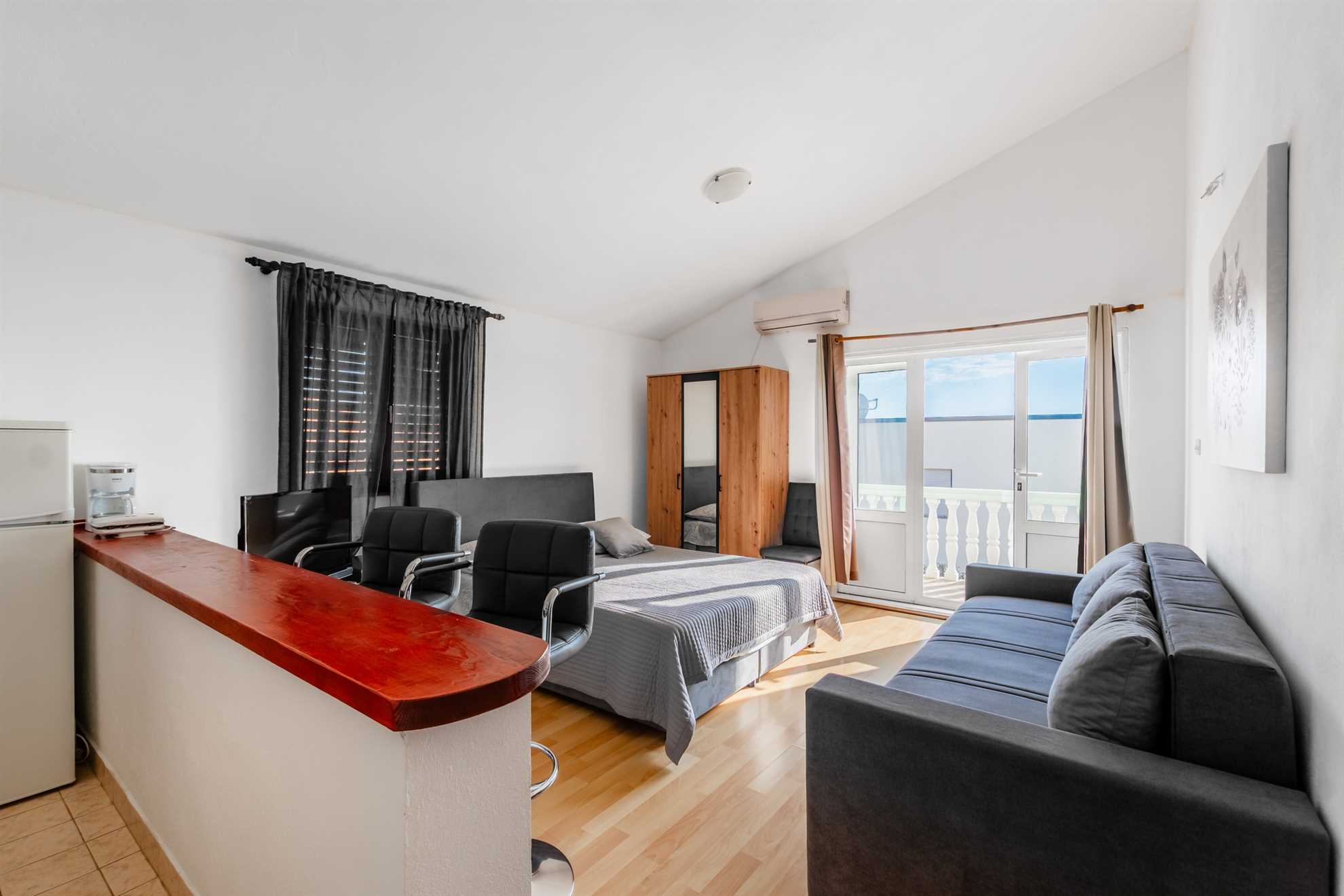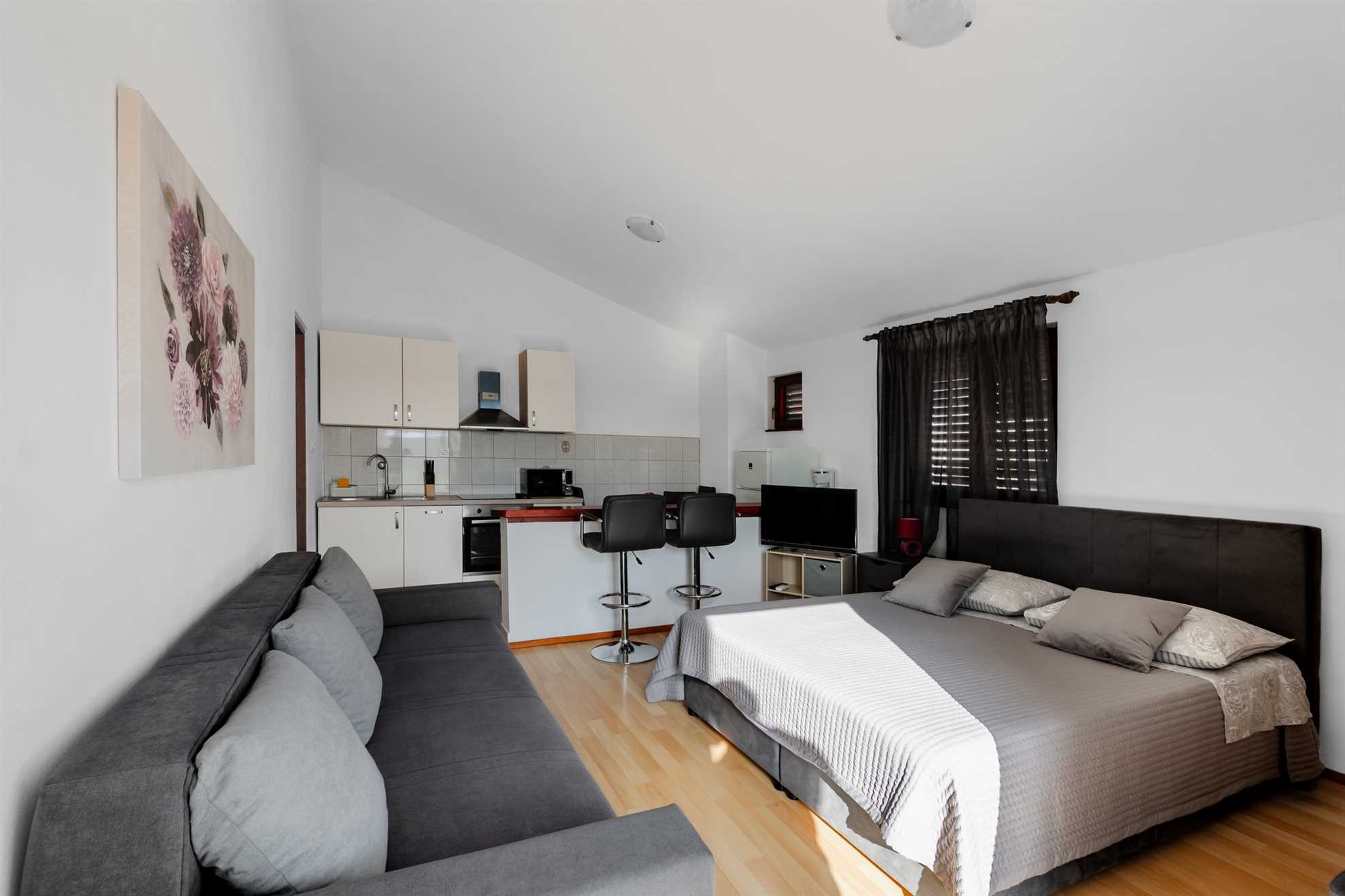 This apartment for 2 persons is located in a quiet area of Vrsi, 200m from the beach called Vrsi-Mulo. The 40 m² studio apartment is located on the second floor of the house and consists of a living room with a dining area and a kitchen, a double bed and a bathroom with a shower. The apartment also has a furnished terrace of 10 m². Air conditioning, a dishwasher, wireless internet and parking on the property are just some of the features of this apartment. Restaurants and shops are just a few minutes' walk away. The center of Vrsi is about 300m away. The municipality of Vrsi is rich in cultural heritage and natural beauty. The residents are mainly engaged in agriculture, tourism and maritime activities. One of the greatest natural resources of the municipality of Vrsi is the beautiful and indented coastline, 34 km long. The coast is dominated by natural coves and hidden beaches, while urban beaches with illuminated promenades can be found in the Vrsi-Mulo and Vrsi-Zukve areas.