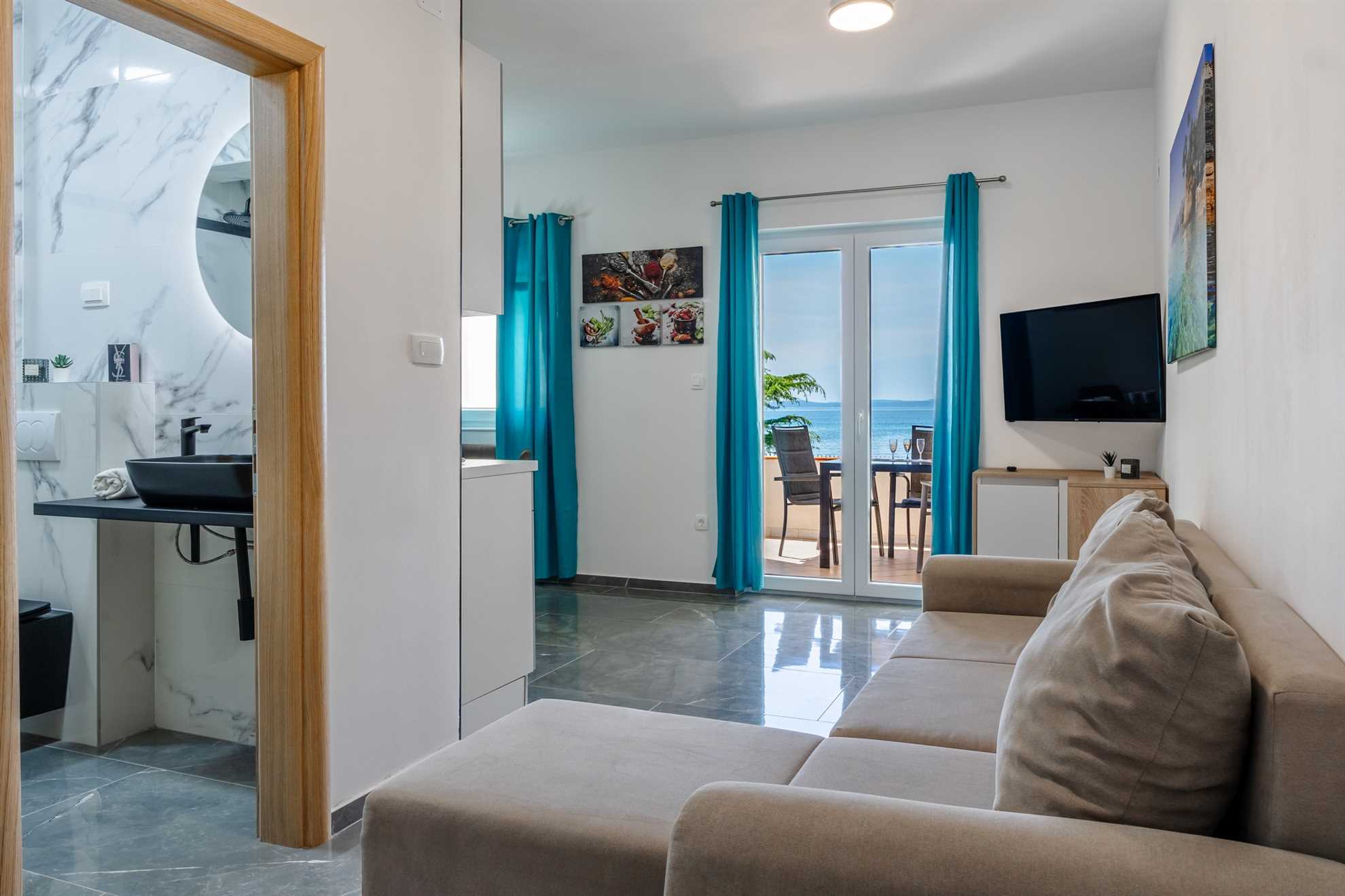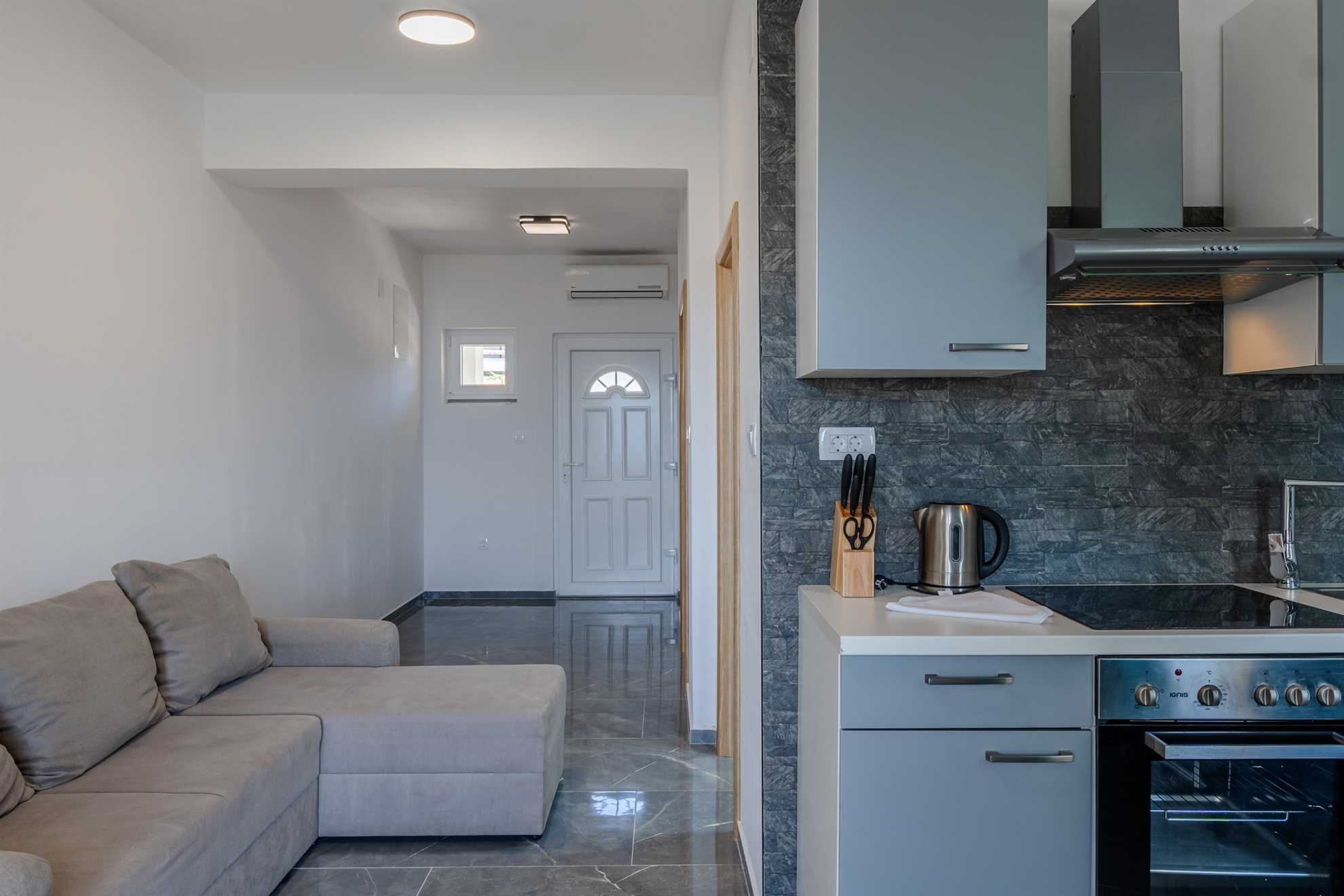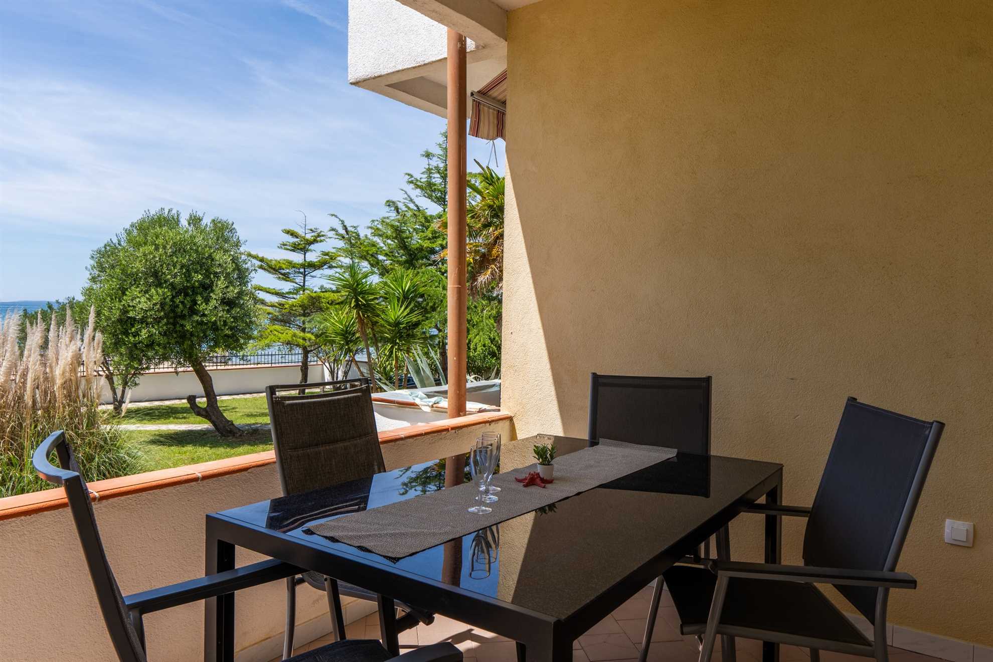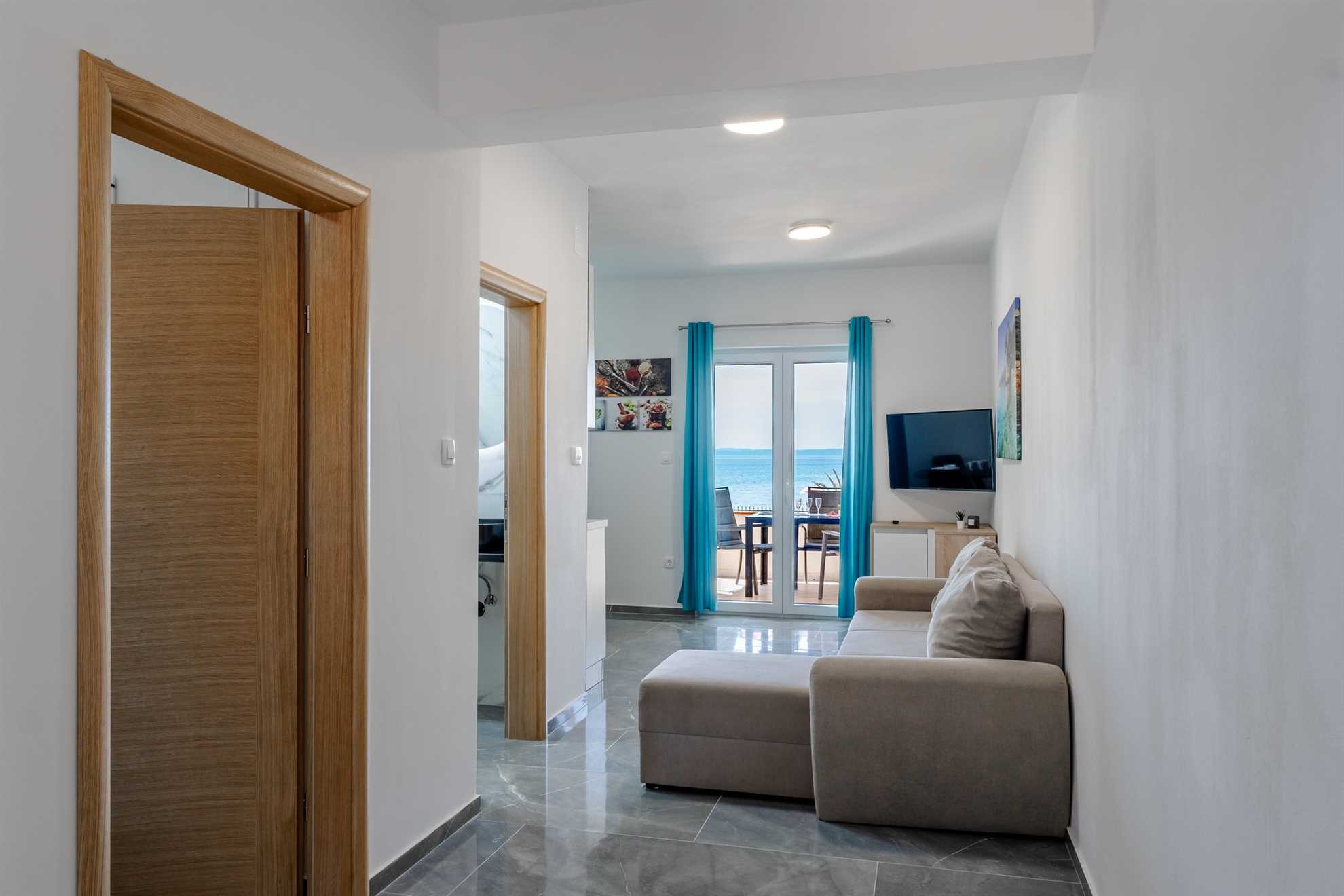 This beachfront apartment is located in the quiet area on the island Vir and offers space for 2-3 persons. The apartment is located on a spacious estate. In the courtyard of the house, for common use, there is a jacuzzi and a barbecue with an outdoor area for hanging out. The nearest beach is about 10m distanced from the house. The 45 m² apartment is located on the ground floor of the house and consists of a kitchen with dining and living area, one bedroom with double bed and a bathroom with shower. In the living room there is a sofa bed for one more person. From the living area you can reach onto a 10 m² terrace with sea view. There is a private parking lot in the yard of the house. A restaurant and supermarket can be found in just a few meters distance.