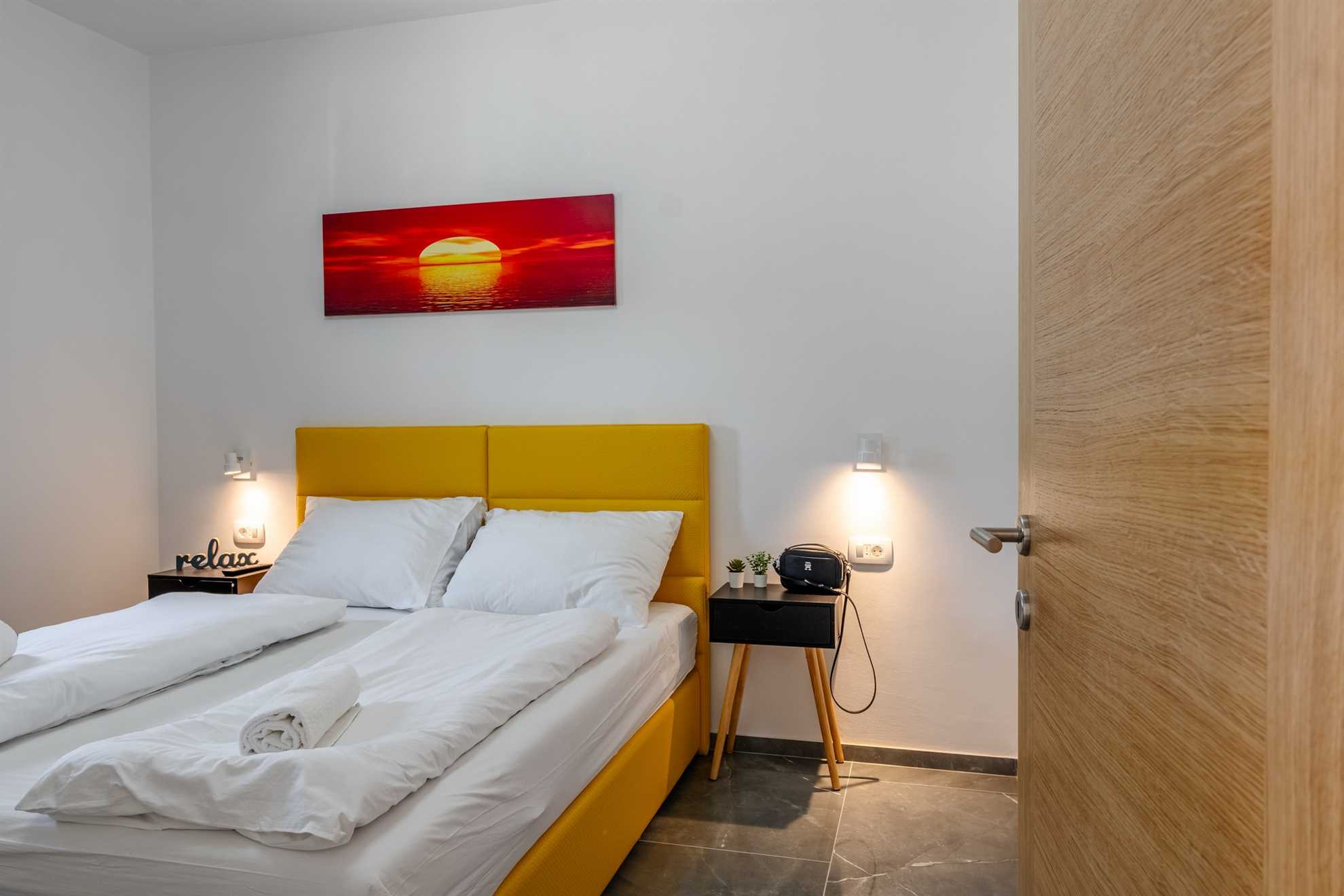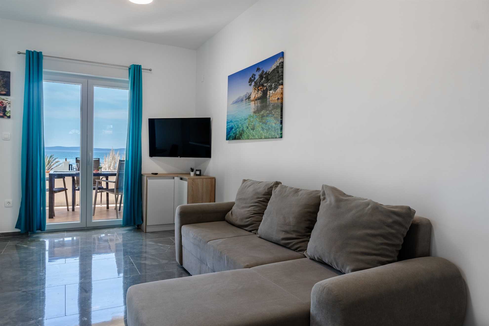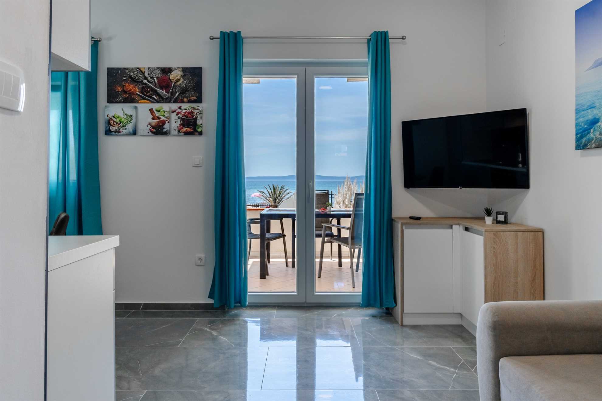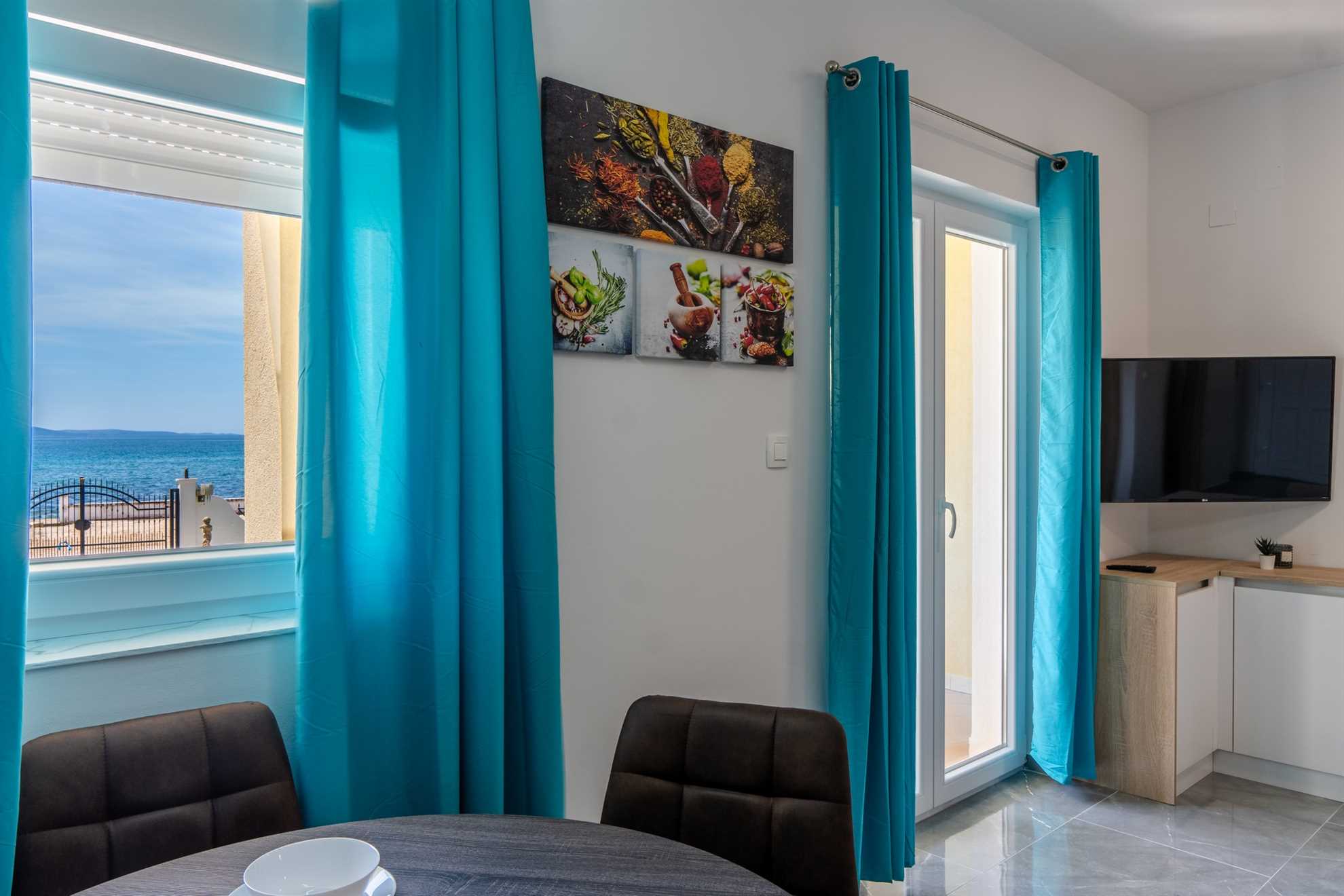 This beachfront apartment is located in the quiet area on the island Vir and offers space for 2-3 persons. The apartment is located on a spacious estate. In the courtyard of the house, for common use, there is a jacuzzi and a barbecue with an outdoor area for hanging out. The nearest beach is about 10m distanced from the house. The 45 m² apartment is located on the ground floor of the house and consists of a kitchen with dining and living area, one bedroom with double bed and a bathroom with shower. In the living room there is a sofa bed for one more person. From the living area you can reach onto a 10 m² terrace with sea view. There is a private parking lot in the yard of the house. A restaurant and supermarket can be found in just a few meters distance.