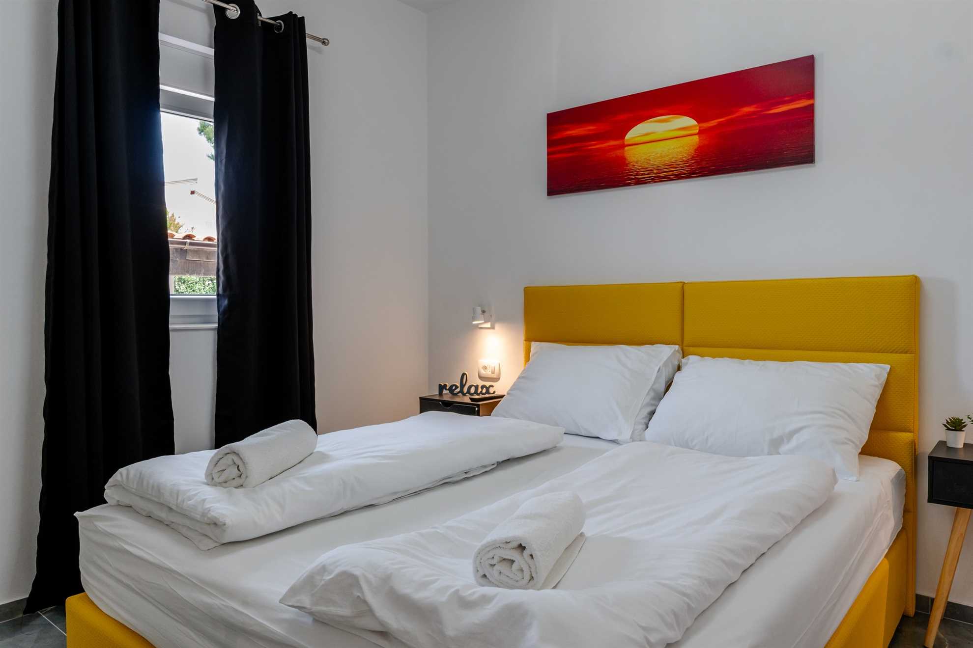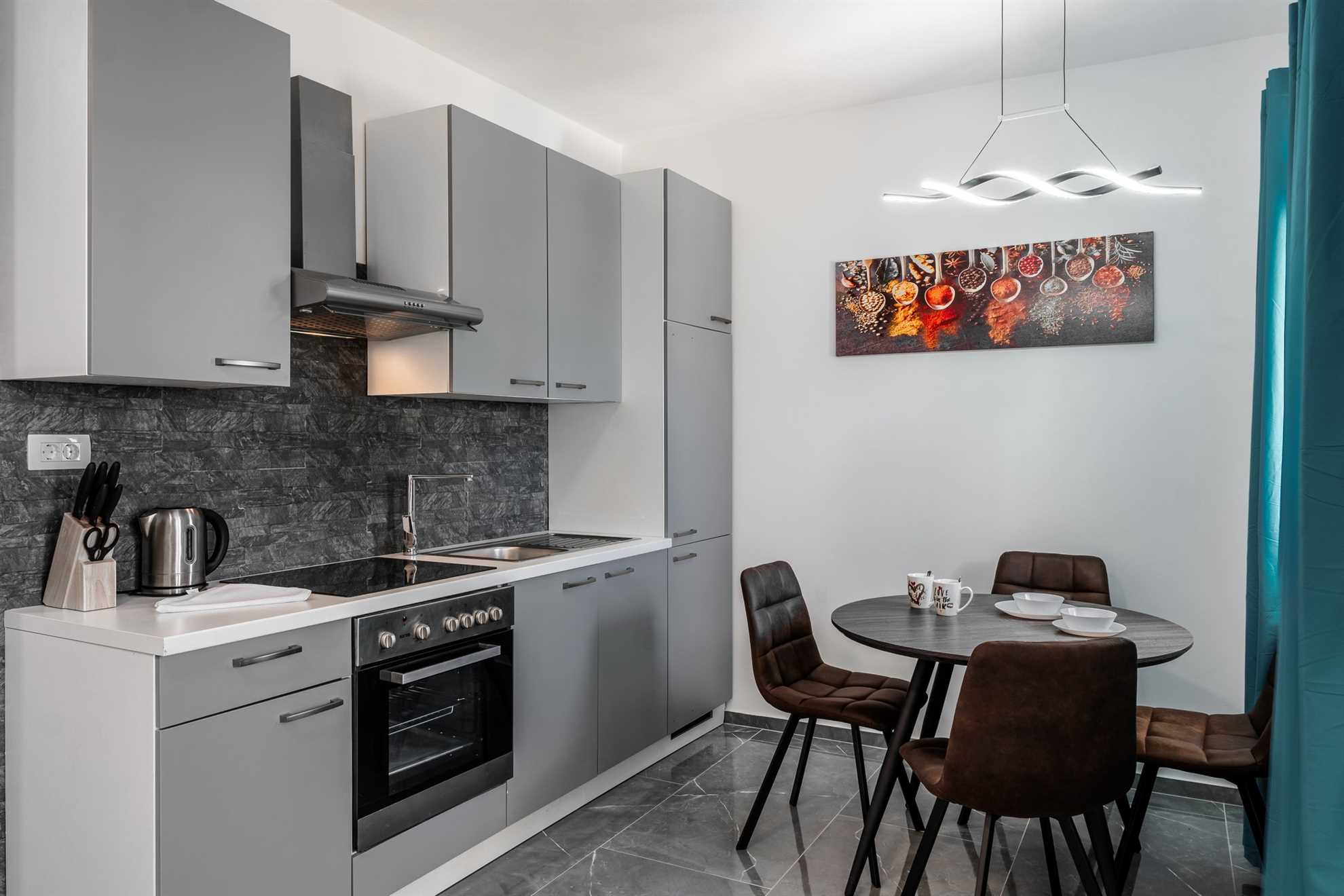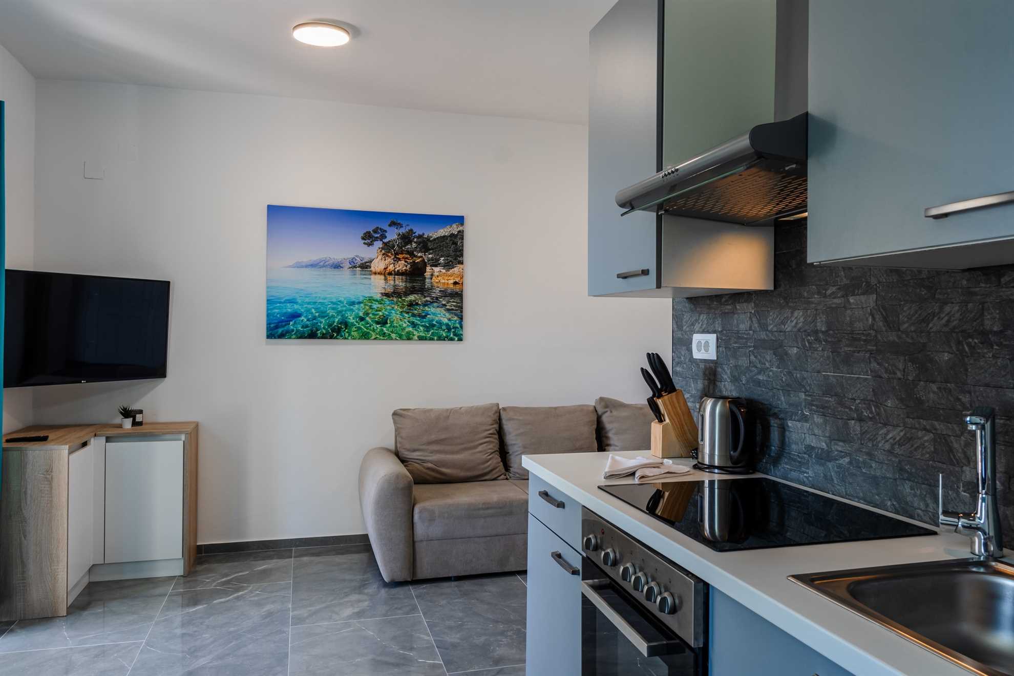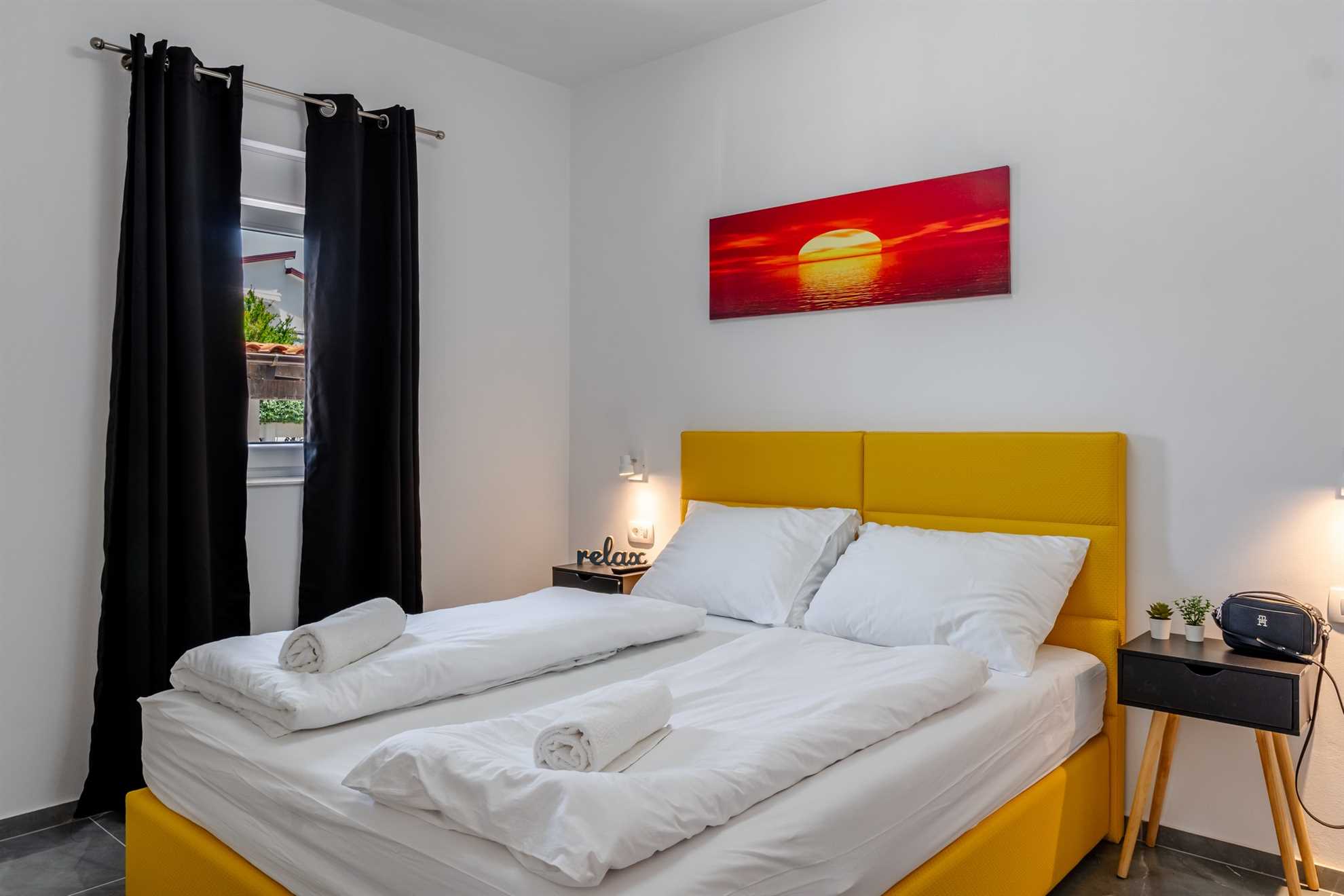This beachfront apartment is located in the quiet area on the island Vir and offers space for 2-3 persons. The apartment is located on a spacious estate. In the courtyard of the house, for common use, there is a jacuzzi and a barbecue with an outdoor area for hanging out. The nearest beach is about 10m distanced from the house. The 45 m² apartment is located on the ground floor of the house and consists of a kitchen with dining and living area, one bedroom with double bed and a bathroom with shower. In the living room there is a sofa bed for one more person. From the living area you can reach onto a 10 m² terrace with sea view. There is a private parking lot in the yard of the house. A restaurant and supermarket can be found in just a few meters distance.